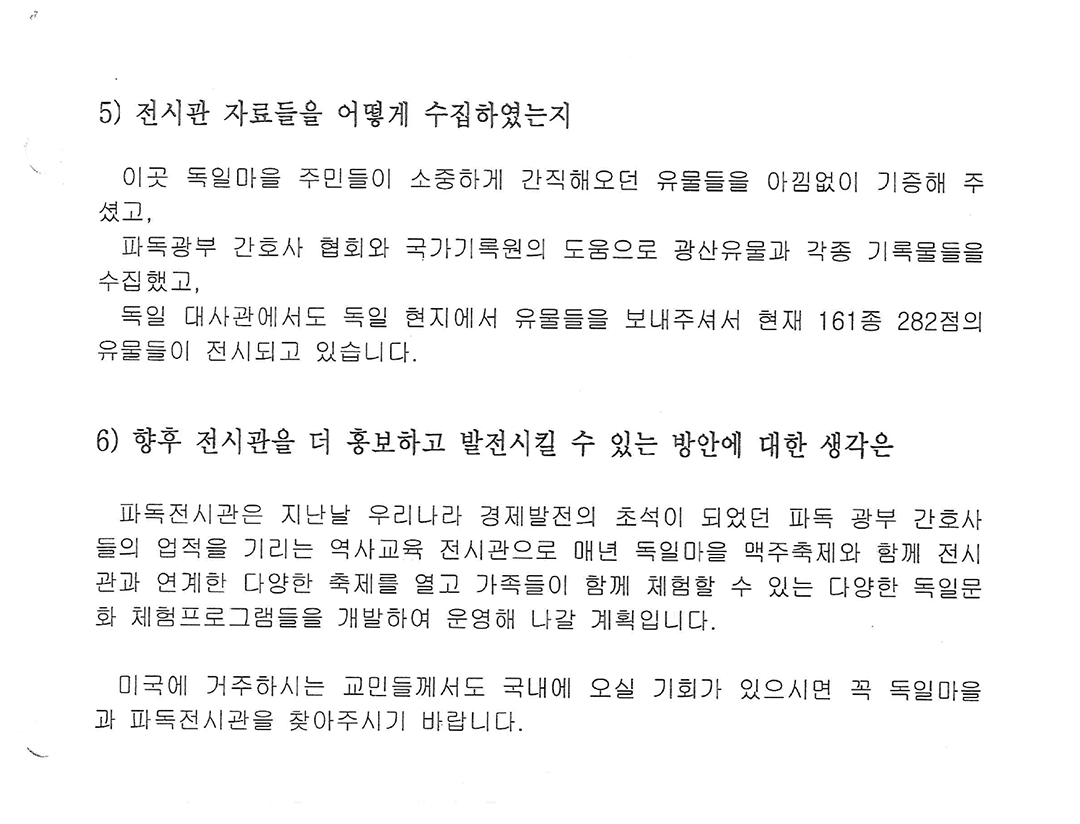 다큐멘터리 인터뷰 자료는 남해 독일마을과 파독전시관이 어떤 배경에서 설립되었고, 어떻게 운영되고 있으며, 그 역사적 가치가 무엇인지를 구체적으로 보여주는 중요한 사료입니다. 이 자료는 여러 가지 면에서 역사적 가치를 지니고 있습니다.